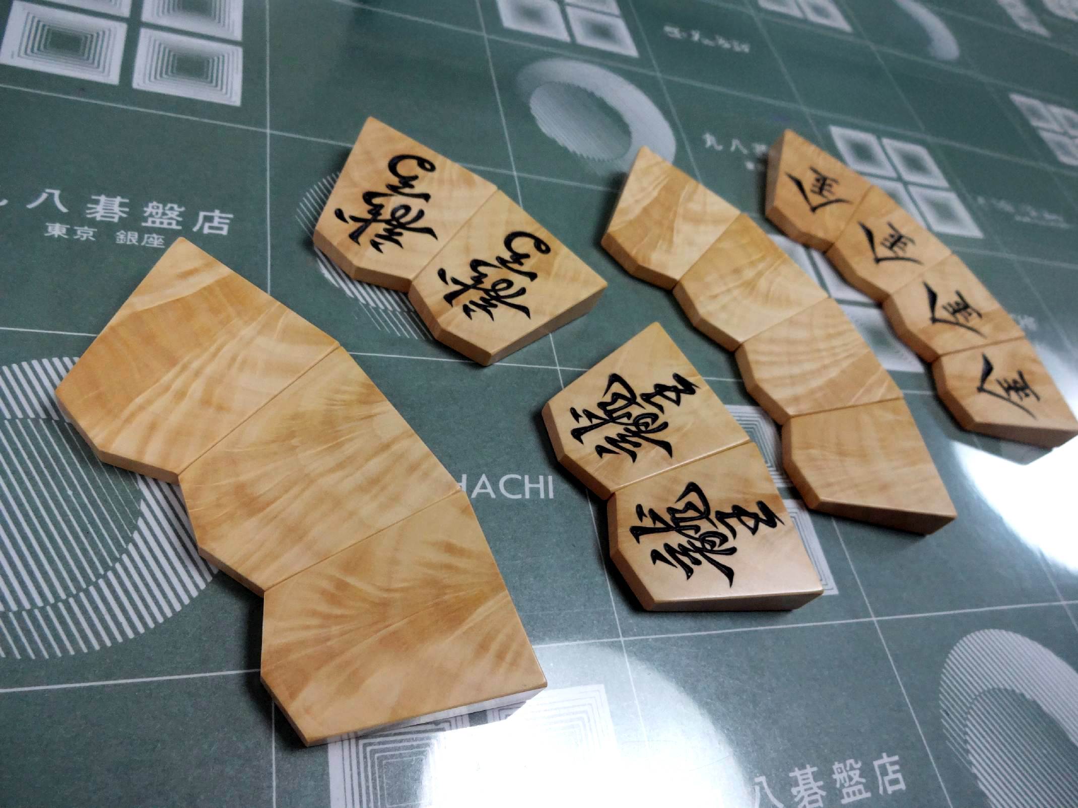 大変ご好評をいただいております蜂須賀氏の彫駒が、久々に完成いたしました。氏が得意とする影水流の書体の中でも、とりわけ力強さと風格を備えた巻菱湖は、ひときわ高い人気を誇ります。その筆致には、静と動が共存するような迫力が宿り、盤上に格別の存在感をもたらします。